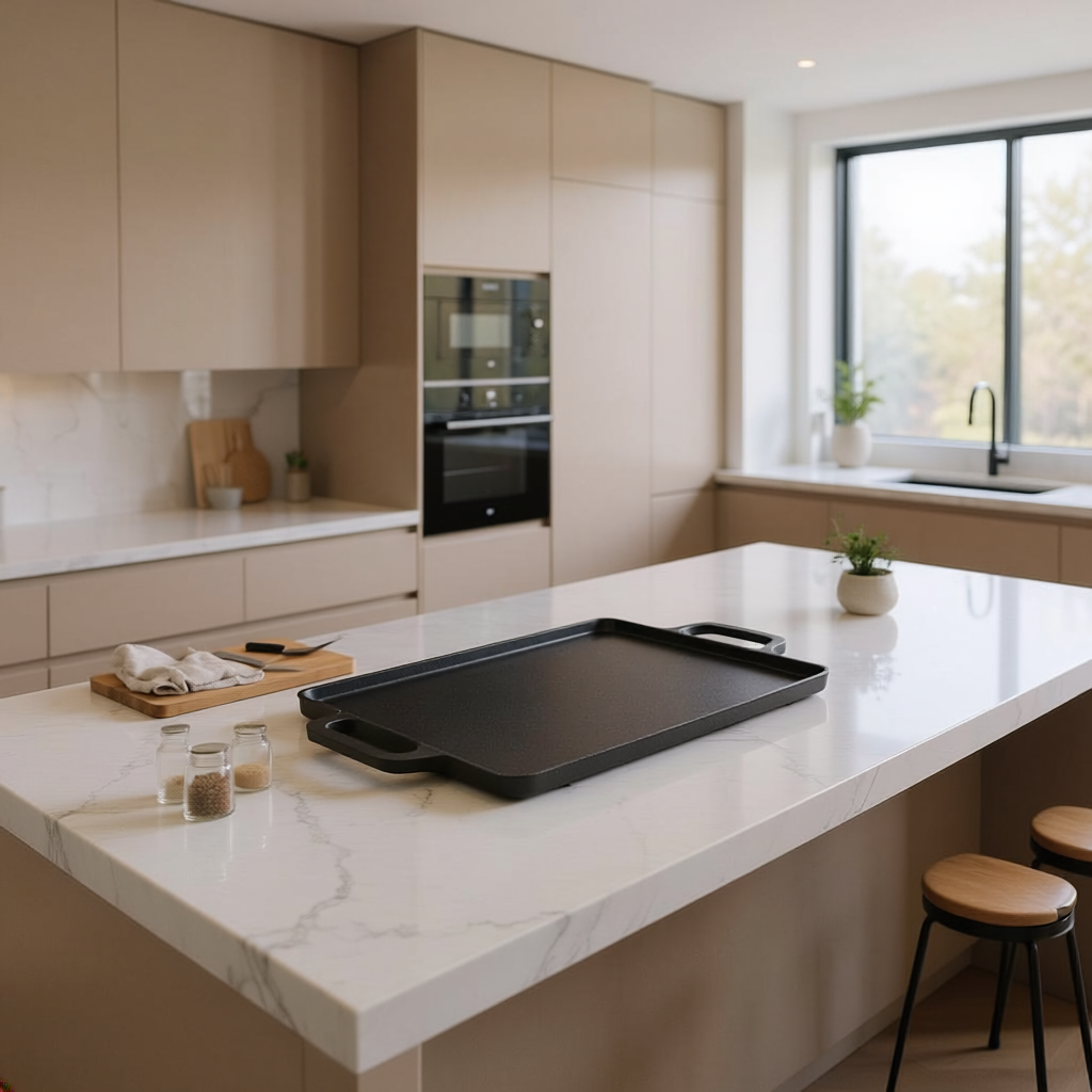 - Doble función en una sola pieza: Un lado tipo grill para marcar carnes y verduras, y el otro plancha para cocinar huevos, pancakes, pescados o arepas.